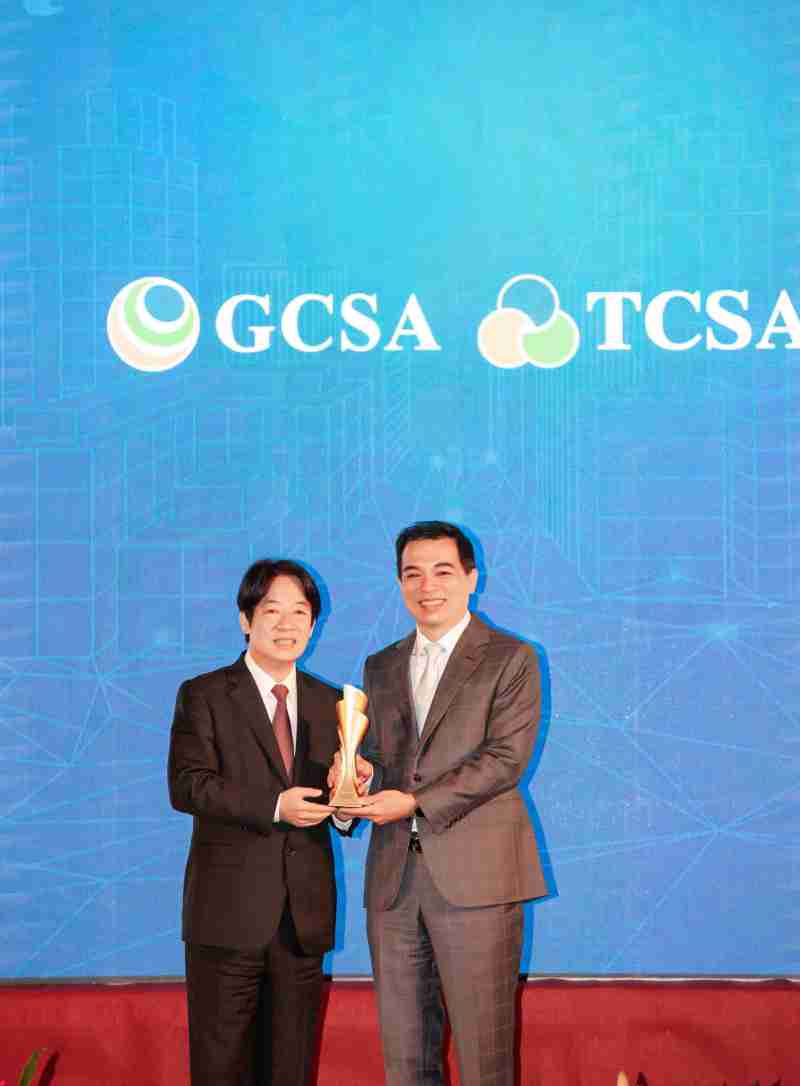达全方位永续表现获全球永续奖及台湾永续奖肯定,,,,由副总统赖清德颁奖 (左),,云顶国际8588yd总经理柯富仁 (右) 代表领奖