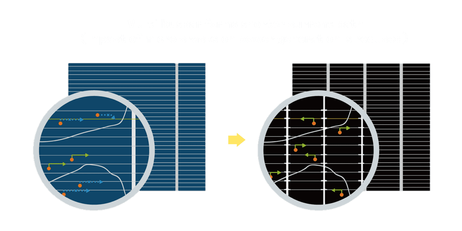 - 电池使用多条铜导线 (Copper wire) 于电池片上形成较短的电流路径,,,提高电流收集效率,,采用圆形设计的铜导线较传统扁平式的铜焊带 (Ribbon),,,,可增加入射至电池的光线量。。。